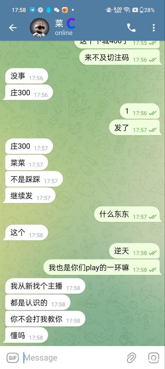​然后他说带我打百家这会没有说过任何输了要包赔的话,后面才忽悠说他和主播对接的,有包赢暗号